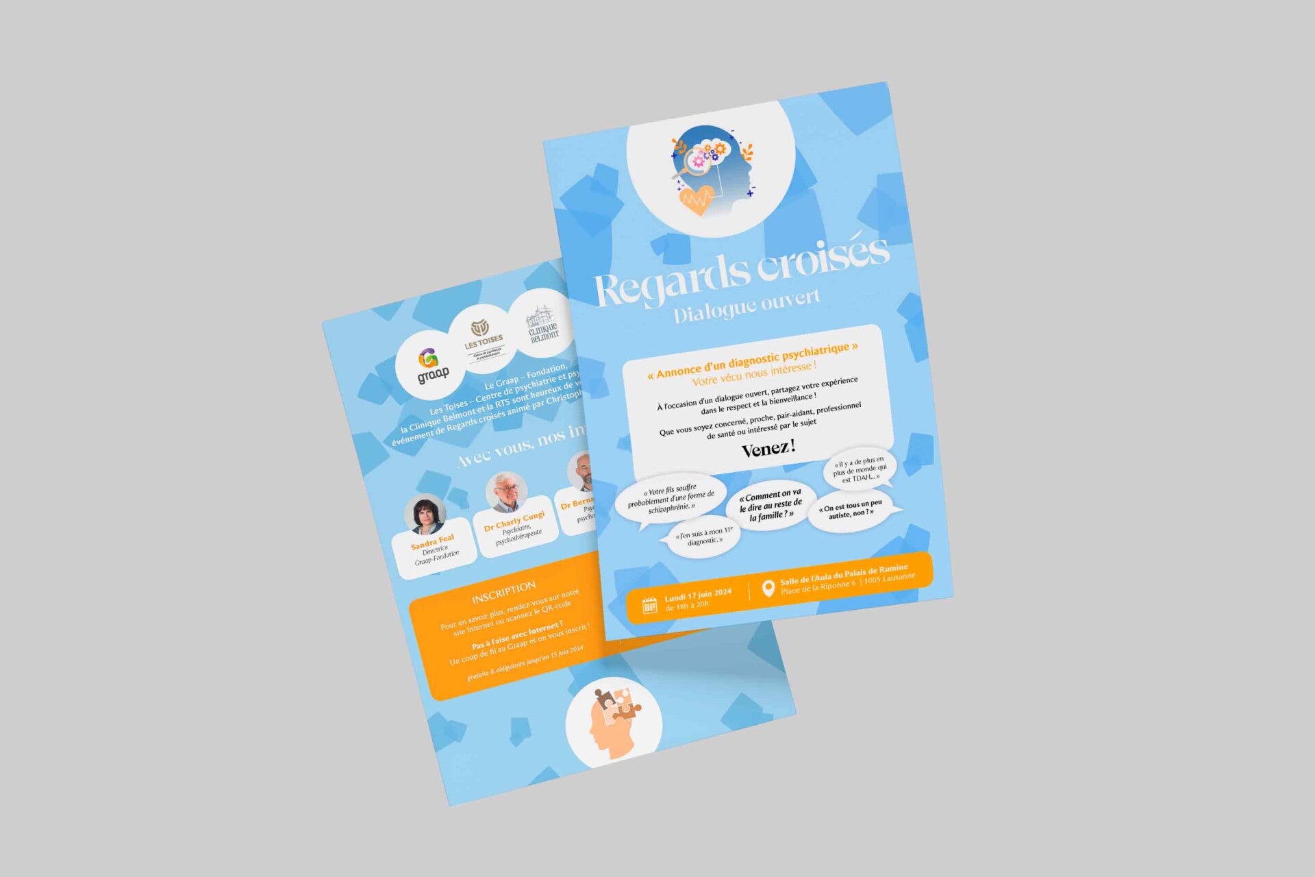 "Regards Croisés" a été un événement organisé en quelques mois seulement avec la participation de la Clinique Belmont, le Graap Fondation et la RTS. Il s'agissait d'un événement public dédié aux personnes concernées par les pathologies mentales. La parole était principalement laissée aux participants. Un véritable dialogue entre patients, pairs-aidants, proches et thérapeutes.